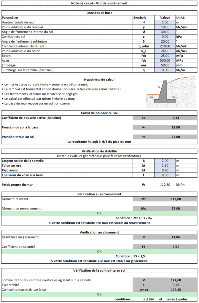 La présente note de calcul a pour objet le dimensionnement d’un mur de soutènement en béton armé assurant la retenue d’un remblai. Le mur doit garantir la stabilité globale (glissement, renversement, portance du sol) et la résistance structurelle (dimensionnement du voile, semelle).